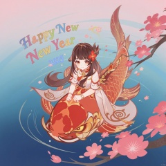 A Chinese-style illustration featuring a solo girl with long, luscious brown hair and blunt bangs, gazing directly at the viewer with a soft blush on her cheeks. She wears a flowing white dress adorned with a vibrant red flower in her locks. The scene takes place atop a majestic orange fish, its tail extending from the top to the bottom of the image, as it floats serenely on a body of water surrounded by pink flowers. In the background, colorful text Happy New Year 2025 swirls around the tranquil atmosphere.