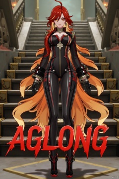 A solo shot of a girl with very long, multicolored hair (blonde, red, and orange), looking directly at the viewer. She has bangs, red eyes, and is standing with arms at her sides. Wearing a jacket, long sleeves, a bodysuit with cutouts, black gloves, high heels, and a spiked bracelet. Her medium breasts and cleavage are visible. The setting includes stairs and a detailed background matching the movie poster theme. Three-dimensional text AGlong is in the middle below. Cinematic lighting creates high contrast and a dramatic atmosphere, with sharp focus enhancing the dynamic composition.