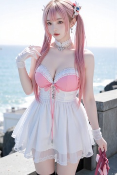 1girl,pink hair, long hair,twintails,hair rings,hair ornament,forehead jewel,brown eyes,detached collar,dress,bare shoulders, tassel,white gloves, white pantyhose,, ((Large Breasts)), ((D cup)), Visible cleavage,Highly detailed face and skin texture,((Bare shoulder)), Double eyelids,Skin Whitening,Long hair,Whitening long legs,Standing by the sea, Fashion Girl, Red lips, Sweet Girl, Beautiful makeup, detail, lifelike, Very detailed, Astonishing, beautiful, Young and energetic, high quality,HD, Colorful, Beautifully, Smooth skin, The skirt is very short, Official Art, Extremely detailed, Movie atmosphere, Soft colors, Natural skin texture, Random scene, random shooting Angle, Black over-the-knee socks, lace hem
