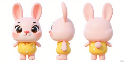 A whimsical cartoon bunny with fur that glows in a pastel pink hue, eyes sparkling like emeralds, and a nose that twinkles in a shade of coral. The bunny sports large, curious eyes and fluffy, perked-up ears. It's dressed in a cheerful yellow dress with polka dots, and a pair of white sneakers with bow ties.