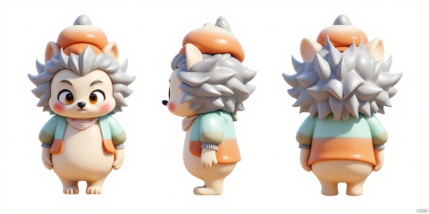 A mischievous cartoon hedgehog with spines that shimmer in a metallic silver, eyes gleaming like topaz, and a belly that's a creamy beige. The hedgehog has tiny, curious eyes and a pointed snout. It's clad in a cozy, striped sweater in shades of teal and orange, and a tiny, matching beret.