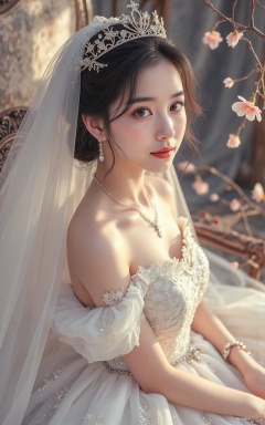 hunsha,1girl,dress,jewelry,solo,black hair,necklace,tiara,wedding dress,white dress,veil,curtains,bracelet,realistic,sitting,flower,bare shoulders,gown,chair,indoors,princess,bride,,Close-up details,outstanding style,adding a touch of dimension to your images without compromising details,whirls of vapour,iridescent textures,(Anime:1.1),ethereal ambiance,delicate details,magical high-concept,32K UHD,sharp focus,best-quality,masterpiece,golden hour,unconventional supreme masterpiece,masterful details,temperate atmosphere,with a high-end texture,in the style of fashion photography,photography,cover,Dynamic Angle,Dynamic posture,(artist:quasarcake:0.8),extreme aesthetic,(wlop:0.6),(honjou raita,lack,rella:0.5, wanke),masterpiece,best quality,good quality,news,very aesthetic,absurdres,Visual impact,A shot with tension,ultra-high resolution,32K UHD,sharp focus,best-quality,masterpiece,Emotionalization,unconventional supreme masterpiece,masterful details,temperate atmosphere,with a high-end texture,in the style of fashion photography,(Visual impact:1.2),giving the poster a dynamic and visually striking appearance,impactful picture,offcial art,colorful,splash of color,movie perspective,masterpiece,best quality,amazing quality,very aesthetic,absurdres,best quality,newest