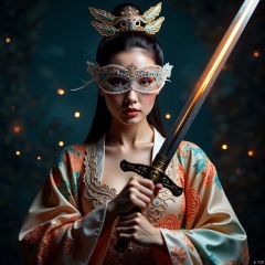 Ancient beautiful woman holding a sword,full body,Glowing swords,movie effects,amazing epic ancient Chinese theme,l,high quality,lace_mask