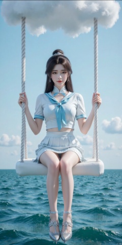 真人肌肤纹理, 4K画质,完美身材,long legs,big_breasts,navel,kind smile,Film texture,kind smile, film and television, surrealism, a girl with a delicate face is sitting on a cloud swing. The girl is wearing a jk sailor uniform, a white short-sleeved shirt, light blue stripes trimming, a light blue tie, white blue pleated skirt, exquisite diamond-encrusted high heels, swing rope The sub is connected to a cloud in the sky, the background is a vast ocean, the water shows a consistent blue-green tone, the sky is also blue-green, blending with the ocean, perfect light and shadow, hyper-realistic photography, sharpening, artistic conception, Consciousness, large areas of blank space, sense of space, haziness, dreams, fog,yuechan,hair bun,hair ornament,longhair