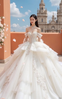 hunsha,a woman is dressed in a white strapless gown adorned with a beaded necklace and earrings. Her hair is styled in a sleek bob,adding a touch of beauty to the scene. Her dress is adorned with white beads and sequins,creating a stunning contrast to her white gown. The backdrop is a vibrant orange wall,in front of a glorious cathedral,blue sky and white clouds,a large number of rose petals flying in the air the left side of the frame,