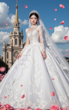 hunsha,1girl,dress,solo,white dress,veil,wedding dress,black hair,bridal veil,tiara,jewelry,looking at viewer,bride,long dress,necklace,brown eyes,realistic,full body,in the background, in front of a glorious cathedral,blue sky and white clouds,a large number of rose petals flying in the air