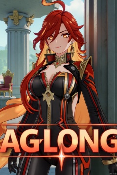 A solo girl with long, multicolored hair (red and orange) and red eyes, wearing jewelry and small earrings, stands in a dynamic pose. She has bangs and her hair falls between her eyes. She wears shoulder armor and pauldrons, and is looking directly at the viewer with a closed-mouth smile. The shot focuses on her upper body. She stands beside a pillar and a throne, with columns in the background. The scene is framed like a movie poster, with three-dimensional text AGlong in the middle below. Cinematic lighting creates high contrast and a dramatic atmosphere, with a detailed and sharp focus on the background elements.