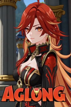A solo girl with long, multicolored (red and orange) hair, red eyes, and bangs partially covering her eyes stands in a dynamic pose, looking directly at the viewer with a closed-mouth smile. She wears intricate jewelry, including earrings, and has small breasts visible under detailed upper body armor with shoulder pauldrons. The scene is set against a detailed background with a movie poster theme, featuring three-dimensional text AGlong in the middle below. Cinematic lighting creates high contrast and sharp focus, enhancing the dramatic atmosphere. A pillar or column adds depth to the composition.