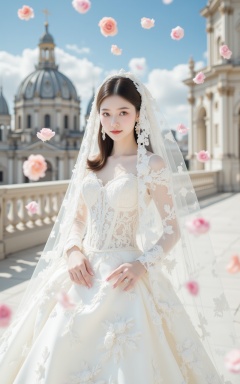 <lora:婚纱14.2:0.9>,hunsha,a woman in a white wedding dress,standing,adorned with a veil,The dress is adorned with white floral designs,adding a touch of beauty to the scene. The woman's hair is styled in a sleek bob,and she's wearing a pair of earrings on her left ear. The backdrop is a stark white wall,in the background,flower,in front of a glorious cathedral,blue sky and white clouds,a large number of rose petals flying in the air,<lora:时尚滤镜10:0.5>,