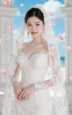 hunsha,a woman in a white wedding dress,standing,adorned with a veil,The dress is adorned with white floral designs,adding a touch of beauty to the scene. The woman's hair is styled in a sleek bob,and she's wearing a pair of earrings on her left ear. The backdrop is a stark white wall,in the background,flower,in front of a glorious cathedral,blue sky and white clouds,a large number of rose petals flying in the air