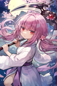 score_9,score_8,score_7, Ghost Reaper & Winter Cherries \(ygo\), 1girl, solo, long hair, hair ornament, red eyes, twintails, pink hair, japanese clothes, scythe,