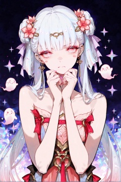 masterpiece,best quality,Good quality,very aesthetic,absurdres,newest,1girl,looking_at_viewer,blush,closed_mouth,upper_body,nail_polish,star_\(symbol\),frown,blush_stickers,short_twintails,hand_on_own_face,purple_background,ghost,straight-on,badge,yin_yang,purple_theme,smiley_face,<lora:ponyv4_noob1_2_adamW-000017:0.7>,<lora:USNR_STYLE_XL_lokr:1>,<lora:jxnew-noob-Tanger-000014:0.8>,jinhsi,jinhsi \(peach blossom\) \(wuthering waves\),(clothes:peach blossom pink dress,alternate costume,bare shoulders:1.2),flower-shaped pupils,1girl,hair ornament,hair flower,twintails,bangs,jewelry,very long hair,