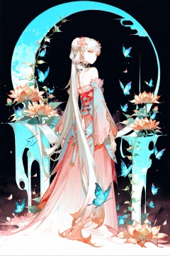 masterpiece,best quality,Good quality,very aesthetic,absurdres,newest,1girl,by rella,solo,long_hair,long_sleeves,dress,closed_mouth,full_body,expressionless,moon,plant,bug,butterfly,limited_palette,vines,two-sided_fabric,blue_butterfly,looking_at_viewer,<lora:ponyv6_noobV1_2_adamW-000017:0.8>,<lora:USNR_STYLE_XL_lokr:1>,<lora:jxnew-noob-Tanger-000014:0.8>,jinhsi,jinhsi \(peach blossom\) \(wuthering waves\),(clothes:peach blossom pink dress,alternate costume,bare shoulders:1.2),flower-shaped pupils,1girl,hair ornament,hair flower,twintails,bangs,jewelry,very long hair,