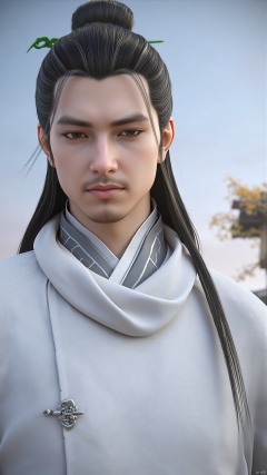 This is a highly detailed CGI rendering of a young man with East Asian features, set against a serene, out-of-focus background that includes a clear sky transitioning from light blue to pale pink at the horizon, and a blurred silhouette of a building with a tiled roof. The man has long, jet-black hair tied into a topknot adorned with a green ribbon, and his hair flows down his back in loose strands. His expression is calm and contemplative, with a slight hint of sadness. He wears a traditional, white, high-collar robe with intricate silver buttons down the front, indicating a formal or ceremonial attire. The robe has a smooth texture and a slight sheen, suggesting a fine fabric like silk. The background features a minimalistic, rustic setting, possibly a historical or traditional Asian location, with the blurred outlines of buildings and a few autumnal leaves, indicating a time of year with cooler temperatures. The overall composition and style of the image are realistic, with a focus on fine details and textures, emphasizing the subject's serene and thoughtful demeanor.