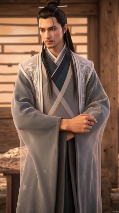 This is a highly detailed digital CGI artwork depicting a young man in traditional East Asian attire. The subject stands in a semi-profile view, facing slightly to the right. He has a calm, composed expression and long, dark hair tied into a topknot, a common hairstyle for East Asian males. His outfit consists of a flowing, white robe with intricate, embroidered floral patterns, complemented by a dark blue, almost black, inner robe. The robe is tied at the waist with a white sash. His hands are clasped in front of him, and he wears a simple, silver ring on his right hand. The background shows a wooden structure with aged, textured wooden planks, suggesting an interior setting with warm, golden light filtering through the slats. The overall color palette is warm, with earthy tones and muted shades of brown and beige, enhancing the traditional and rustic ambiance. The textures of the fabric and wood are meticulously detailed, contributing to the realism of the artwork. The image conveys a sense of serenity and cultural heritage, with a blend of historical and modern elements.