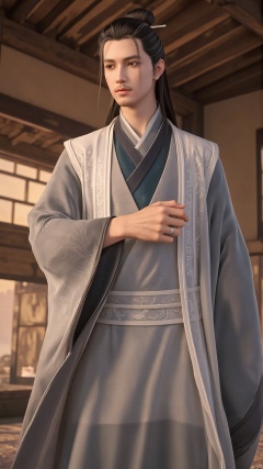 This is a highly detailed digital CGI artwork depicting a young man in traditional East Asian attire. The subject stands in a semi-profile view, facing slightly to the right. He has a calm, composed expression and long, dark hair tied into a topknot, a common hairstyle for East Asian males. His outfit consists of a flowing, white robe with intricate, embroidered floral patterns, complemented by a dark blue, almost black, inner robe. The robe is tied at the waist with a white sash. His hands are clasped in front of him, and he wears a simple, silver ring on his right hand. The background shows a wooden structure with aged, textured wooden planks, suggesting an interior setting with warm, golden light filtering through the slats. The overall color palette is warm, with earthy tones and muted shades of brown and beige, enhancing the traditional and rustic ambiance. The textures of the fabric and wood are meticulously detailed, contributing to the realism of the artwork. The image conveys a sense of serenity and cultural heritage, with a blend of historical and modern elements.