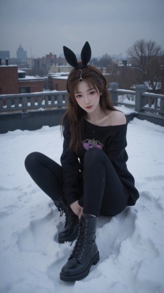Wearing a black bunny ear headband, a hooded sweatshirt, black leggings and high snow boots, she sat on a snow-covered roof. She is smiling, sitting relaxedly, and her eyes are natural. The rooftops are dotted with gray railings and buildings, and the sky is overcast with gray tones. The ground is covered with deep snow and the light is soft, creating a calm, tranquil atmosphere. The overall tone of the picture is dark, but the color saturation is moderate, and it has a slight retro film filter effect. The details of the clothing are exquisite, from the smooth tailoring of bunny ear headbands and hooded sweatshirts to the delicate texture of high-top snow boots. The composition is simple, the subject is prominent, and the background and foreground are in sharp contrast. The overall style is light, fashionable and has a bit of winter casual atmosphere.
