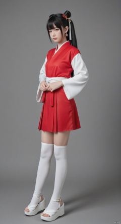 1girl,solo,long hair,black hair,hair ornament,hair rings,hair bun,ponytail,double bun,bangs,thighhighs,jewelry,full body,earrings,boots,white thighhighs,white footwear,skirt,black skirt,hakama,hakama skirt,chinese clothes,dress,red dress,red long sleeves,red wide sleeves,canghaisz,score_9_up score_8_up score_7_up.,OKOBO SANDALS, PLATFORM FOOTWEAR,