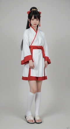 1girl,solo,long hair,black hair,hair ornament,hair rings,hair bun,ponytail,double bun,bangs,thighhighs,jewelry,full body,earrings,boots,white thighhighs,white footwear,skirt,black skirt,hakama,hakama skirt,chinese clothes,dress,red dress,red long sleeves,red wide sleeves,canghaisz,score_9_up score_8_up score_7_up,CL3ARSL1DES SANDALS,
