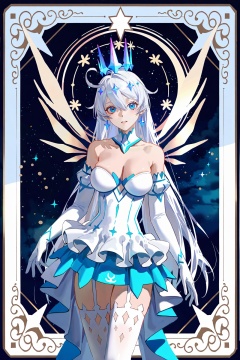 ((artist:betabeet)),artist:john_kafka,artist:nixeu,artist:quasarcake,(by xilmo, by modare, by reoen:1.1),(hyperrealistic:1.1),(high_contrast:1.1),(holy_(\theme\):1.2),(card_\(theme\):1.1),solo,long hair,large breasts,(black-color-scheme:1.1),character card,abstract sun,moon and stars,thick line,murals,holy light,mural moon,simple black background,angels come,stars,card border,frame pattern,<lora:kiana-young-noob-Tanger:0.8>,kiana kaslana,dongzhi,dongzhi,dongzhi dress,5th clothes,1girl,blue eyes,gloves,white thighhighs,dress,long hair,elbow gloves,white hair,crystal crown,bare shoulders,bangs,
