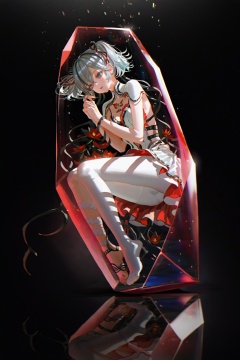 artist:nixeu,artist:john kafka,artist:wanke,artist:fuzichoco,artist:quasarcake,lonesomnia,original,highres,<lora:jijia-gnoobv-Tanger-000010:0.7>,jijia,2d,anime,1girl,1girl,black_background,closed_eyes,fetal_position,frutiger_aero,shadow,solo,transparent trapped,full_body,trapped in crystal,<lora:chun-noob-Tanger-000013:0.8>,chun,white chun-def dress,1girl,red floral tattoo on chest,breasts,twintails,multicolored hair,grey hair,grey eyes,dress,white single pantyhose,
