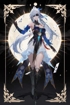 8k,masterpiece,best quality,amazing quality,very aesthetic,absurdres,(ultra-detailed),(high detailed skin),((artist:betabeet)),artist:john_kafka,artist:nixeu,artist:quasarcake,original,normal_quality,(by xilmo, by modare, by reoen:1.1),(hyperrealistic:1.1),(high_contrast:1.1),(holy_(\theme\):1.2),(card_\(theme\):1.1),solo,long hair,fur trim,large breasts,(black-color-scheme:1.1),character card,abstract sun,moon and stars,thick line,<lora:jingliu-noob-Tanger-000014:0.8>,jinliu,default clothes,silver hair,blue and white chinese dress,Blindfold with crescent marking,1girl,eyepatch,long hair,boots,black gloves,bangs,bare shoulders,ponytail,black footwear,covered eyes,Blindfold,<lora:neg101-000008:0.5>,murals,holy light,mural moon,simple black background,angels come,stars,card border,frame pattern,