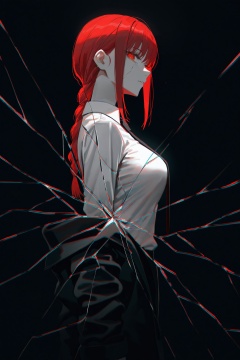 by [lack|fuzichoco|lam|kinta \(distortion\)|wlop|quasarcake|nixeu|happoubi jin],dark,black theme,spot color,red eyes,looking at viewer,makima \(chainsaw man\),jacket,necktie,black background,from side,high contrast,indoors,impasto,cracked glass,reflection,chromatic aberration,glitch,masterpiece,best quality,very aesthetic,absurdres,<lora:illustrious_noobai_epsilon_pred_1_masterpieces_v1:1>,<lora:illustrious_noobai_epsilon_pred_1_best_quality_v1:1>,