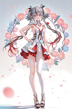 8k, best quality, masterpiece, (ultra-detailed), (high detailed skin),((artist:reoen),(artist:fuzichoco),(artist:atdan),(artist:torino_aqua),year 2024:0.8)1girl, [artist:wlop], [artist:ningen_mame], artist:ciloranko, [[artist:rhasta]], artist:tidsean, colorful, detailed light, light leaks, sunlight, bokeh, blurry foreground, ray tracing, lens flare, cinematic lighting,full body, full shot, standing, looking at viewer, (solo:1.2), simple background, (white background:1.2), hand on own hip, (white background:1.1),<lora:chun-noob-Tanger-000013:0.8>, chun, white chun-def dress, 1girl, red floral tattoo on chest, breasts, twintails, multicolored hair, grey hair, grey eyes, dress, white single pantyhose,A full-body portrait of a young girl, standing gracefully, pastel art style, high-key lighting, shoujo manga influence, hd quality, delicate details,