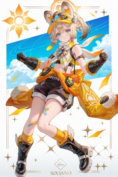 8k,masterpiece,best quality,amazing quality,very aesthetic,absurdres,(ultra-detailed),(high detailed skin),((artist:betabeet)),artist:john_kafka,artist:nixeu,artist:quasarcake,(artist:fuzichoco),(artist:atdan),(artist:torino_aqua),(by xilmo, by modare, by reoen:1.1),(hyperrealistic:1.1),(high_contrast:1.1),(holy_(\theme\):1.2),(card_\(theme\):1.1),solo,(white-color-scheme:1.1),character card,abstract sun,moon and stars,solo,<lora:kachina-noob-Tanger-000014:0.9>,kachina,default clothes,yellow headweaer,1girl,solo,blue eyes,boots,animal ears,black shorts,closed mouth,gloves,v-shaped eyebrows,socks,bandaid,black footwear,<lora:neg101-000008:0.4>,murals,holy light,mural sun,simple white background,angels come,clouds,card border,frame pattern,facial light,