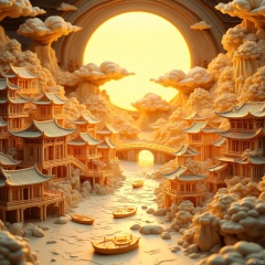 The entire scroll is dotted with three-dimensional figures, magnificent buildings, the bright moon, clouds, cloud pillars, rivers and wooden bridges (three-dimensional Chinese classical town architecture, level 0.9), (yellow light, level 0.9), showing origami effect, three-dimensional relief style , lifelike details, sculptural feel, 8K high-definition painting, Scroll of ancient painting