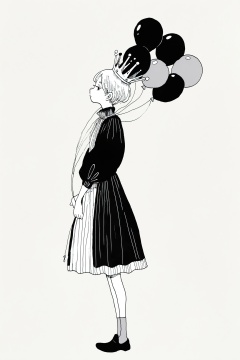 masterpiece,best quality,good quality,<lora:jijia-gnoobv-Tanger-000010:0.7>,jijia,2d,anime,artist:hey,crown,1girl,dress,monochrome,balloon,solo,simple background,short hair,long sleeves,holding,full body,shoes,from side,standing,socks,greyscale,profile,holding balloon,grey background,puffy sleeves,