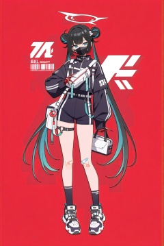 masterpiece,best quality,flat color,plane illustration,<lora:jijia-gnoobv-Tanger-000014:0.7>,jijia,2d,anime,1girl,black hair,bandaid,halo,red background,long hair,solo,bandaid on leg,hair bun,mask,bag,double bun,barcode,mouth mask,socks,looking at viewer,full body,twintails,claws,multicolored hair,hair ornament,blue eyes,bangs,wings,very long hair,shorts,an anime character with a panda on her arm,this is a drawing of a anime girl with different outfits,