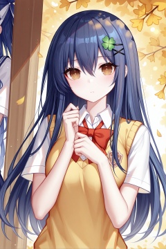 masterpiece, best quality, newest, absurdres, highres,(quan \(kurisu tina\):0.6, ),(binggong asylum:0.6 ),(rimuu:0.5),(mignon:0.5),(sheya:0.5), itsuka shiori, 1girl, blue hair, brown eyes, hairclip, four-leaf clover hair ornament,school uniform, sweater vest, <lora:shioriXLNAI:1>