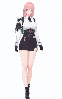 8k, best quality, masterpiece, (ultra-detailed), (high detailed skin), (by nanoless, by misumi \(macaroni\),:0.5), A full-body portrait of a young girl, standing gracefully, pastel art style, high-key lighting, shoujo manga influence, hd quality, delicate details, full body, full shot, standing, looking at viewer, (solo:1.2), simple background, white background, <lora:Yanagi-sd-Tanger-000019:0.8>, Yanagi, Yanagi-def clothes, Black right shoulder armor, 1girl, pink hair, gloves, black gloves, black skirt, pink eyes, long hair, breasts, shirt, black footwear, belt, boots, white shirt,