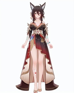 8k, best quality, masterpiece, (ultra-detailed), (high detailed skin), (by nanoless, by misumi \(macaroni\),:0.5), A full-body portrait of a young girl, standing gracefully, pastel art style, high-key lighting, shoujo manga influence, hd quality, delicate details, full body, full shot, standing, looking at viewer, (solo:1.2), simple background, white background, <lora:tingyun-sd-Tanger-000019:0.8>, tingyun, (fugue \(honkai: star rail\), fugue, 2nd clothes, wanggui black dress, golden tattoo on shoulder:1.2), 1girl, animal ears, green eyes, long hair, japanese clothes, fox ears,