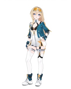 8k,best quality,masterpiece,(ultra-detailed),(high detailed skin),(by nanoless, by misumi \(macaroni\),:0.5),A full-body portrait of a young girl,standing gracefully,pastel art style,high-key lighting,shoujo manga influence,hd quality,delicate details,full body,full shot,standing,looking at viewer,(solo:1.2),simple background,white background,<lora:dertg-sd-Tanger:0.8>,durandal \(sky bright and clear\) \(honkai impact\),dertg,dertg clothes,1girl,gloves,blue eyes,blonde hair,fingerless gloves,thighhighs,jacket,virtual youtuber,blue jacket,