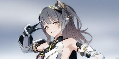 1girl, solo, long hair, breasts, looking at viewer, smile, bangs, gloves, dress, bare shoulders, brown eyes, yellow eyes, upper body, ponytail, grey hair, small breasts, black gloves, armpits, v, headgear, mechanical arms, single mechanical arm, v over eye, sideless outfit