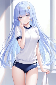 masterpiece, best quality, newest, absurdres, highres,(chen bin: 0.5),(hiten \(hitenkei\):0.4),(rimuu:0.5),(mignon:0.5),(sheya:0.6),solo,, izayoi miku(nor), 1girl, long hair, hair ornament, blue hair, grey eyes,smile,gym uniform,standing, buruma,panties under buruma<lora:yzzbht——【Illustrious】hans:0.4>,<lora:izamikuXLNAI:1>