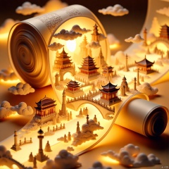 Tang Dynasty palaces, the Silk Road, intricate miniature landscapes within a hollowed, glowing golden film roll. Each frame features a 3D, ultra-detailed Daming Palace miniature, radiating faint golden luminescence, surrounded by calligraphic inscriptions on empty scroll ends. Clean background, close-up, focus on scroll-wrapped miniature landscape with volumetric luminescence, luminescent particles, and a shallow depth of field, blending sci-fi style with ancient, large-scale 3D antiquity, soft light, tulle foreground, 4CD, panned photography, hi-def camera, paper cutout details.,Scroll painting
