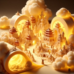 Tang Dynasty palaces, the Silk Road, intricate miniature landscapes within a hollowed, glowing golden film roll. Each frame features a 3D, ultra-detailed Daming Palace miniature, radiating faint golden luminescence, surrounded by calligraphic inscriptions on empty scroll ends. Clean background, close-up, focus on scroll-wrapped miniature landscape with volumetric luminescence, luminescent particles, and a shallow depth of field, blending sci-fi style with ancient, large-scale 3D antiquity, soft light, tulle foreground, 4CD, panned photography, hi-def camera, paper cutout details.,Scroll painting