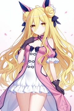 masterpiece, best quality, newest, absurdres, highres,(quan \(kurisu tina\):0.6, ),(chen bin:0.5),(rimuu:0.5),(mignon:0.5),(sheya:0.5),,petite pretty little girl,  mukuro(equip), 1girl, blonde hair, long hair, yellow eyes, messy hair, dress, double bun, gloves, clothing cutout<lora:mukuroXLNAI-000010:1>