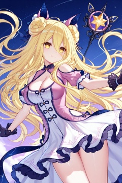 masterpiece, best quality, newest, absurdres, highres,(quan \(kurisu tina\):0.6, ),(chen bin:0.5),(rimuu:0.5),(mignon:0.5),(sheya:0.5), mukuro(equip), 1girl, blonde hair, long hair, yellow eyes, messy hair, dress, double bun, gloves, clothing cutout,smilestar,floating, sky,outstretched arm, windows logo, <lora:mukuroXLNAI-000010:1>