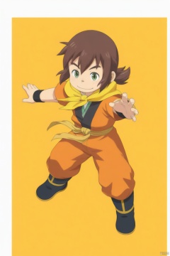 mangi,brown hair,ponytail,green eyes,orange jumpsuit,yellow scarf,black belt,black boots,