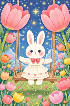 cartoon illustration,This is a whimsical cartoon hand-drawn digital illustration,Cute little bunny, dressed in a white Lolita dress with a pink bow, sitting on a swing with a huge tulip flower, surrounded by big tulips, stars, clouds, stars,,cartoon illustration,