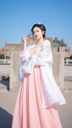 The image is a portrait of a young woman wearing a traditional Chinese dress. She is standing in front of a stone structure with a blue sky in the background. The woman is wearing a long,flowing pink dress with intricate embroidery and a white shawl draped over her shoulders. She has a flower crown on her head and her hair is styled in a bun. The dress has a high neckline and long sleeves,and the skirt is full and flowing. The overall style of the dress is elegant and traditional.,