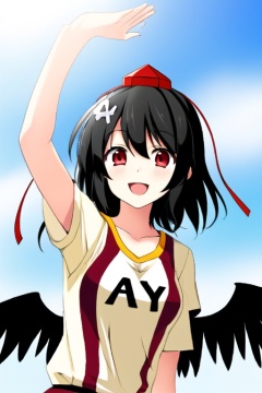 shameimaru aya,1girl,hat,solo,wings,red eyes,black hair,smile,open mouth,camera,<lora:aya5:1>,pom pom hair ornament,sportswear,