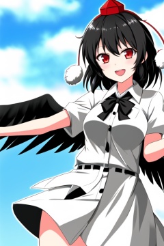 shameimaru aya,1girl,hat,solo,wings,red eyes,black hair,smile,open mouth,camera,<lora:aya5:1>,pom pom hair ornament,