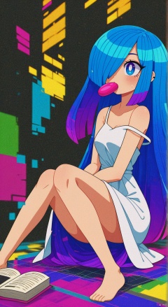 masterpiece, best quality, amazing quality, absurdres, newest, very awa,Shi1ro_vo1d_illu, glitch art,glitch, blurry edges, film grain,1girl, long hair, barefoot, dress, solo, sitting, book, hair over one eye, bubble blowing, blue eyes, blue hair, white dress, hair ornament, stuffed toy, strap slip