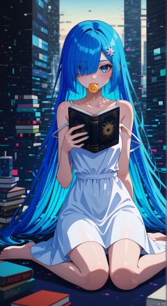 masterpiece, best quality, amazing quality, absurdres, newest, very awa,Shi1ro_vo1d_illu, glitch art,glitch, blurry edges, film grain,1girl, long hair, barefoot, dress, solo, sitting, book, hair over one eye, bubble blowing, blue eyes, blue hair, white dress, hair ornament, stuffed toy, strap slip