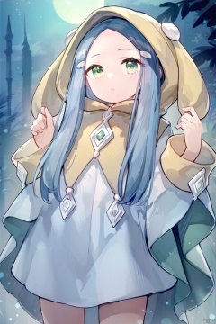 score_9,score_8,score_7, Ghost Mourner & Moonlit Chill \(ygo\), 1girl, solo, long hair, green eyes, blue hair, hood,